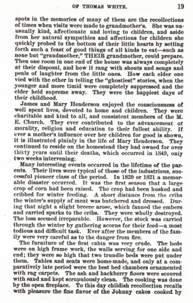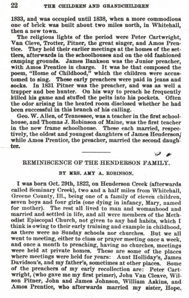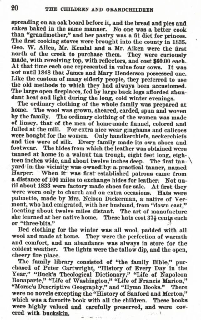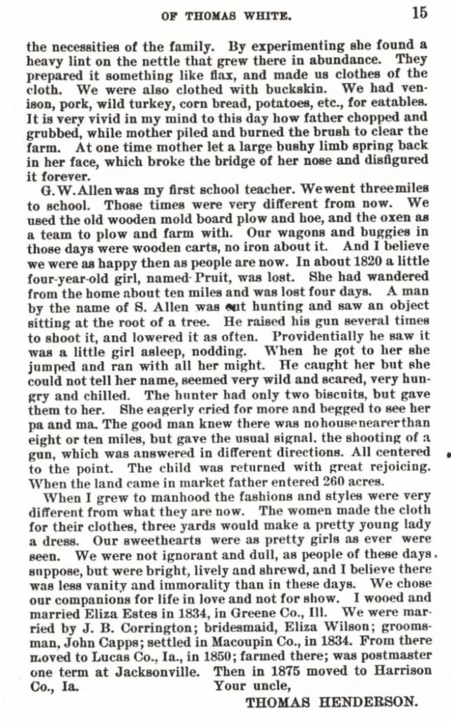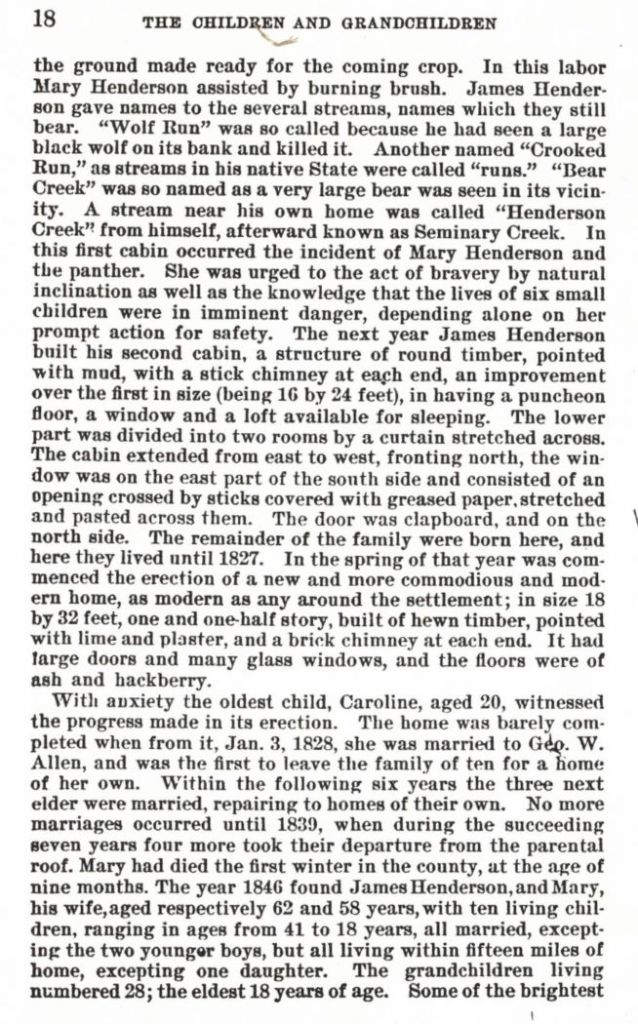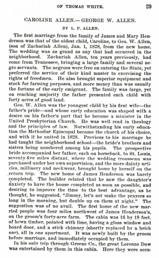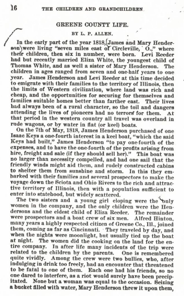 It is the work of Luther Prentice Allen that most, if not all, of my “Henderson” history originates. His books were made possible by the input of prior generations. Several of his mother’s (Caroline Henderson Allen) siblings sent snippets of family life as children of the pioneers, James and Mary Henderson. … But first is the “short sketch” written by his uncle Thomas Henderson, titled Trip From Ohio.
