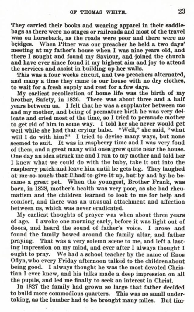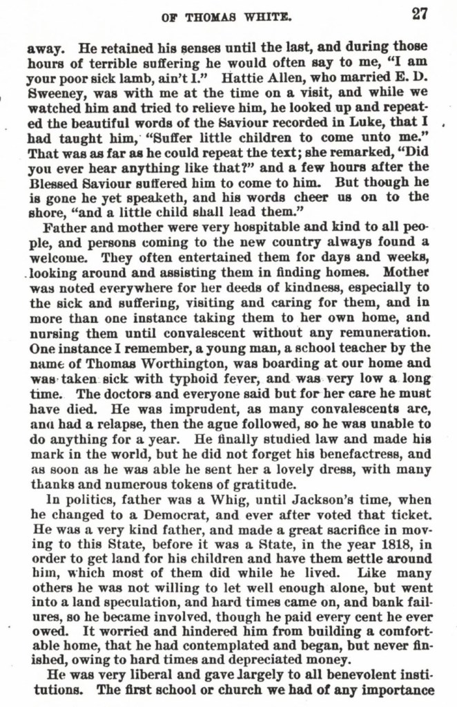 Tuesday, 11/19/2024 – I did not get much accomplished recently. On starting I realized I best setup a folder with the files needed. … This post consists of the line leading to the families of Lydia Henderson, who married Ben Thorpe, along with some interesting history I found. The history involved scanning and converting pages from the book, Sketches of Thomas White, his Children and Grandchildren. If you find the pages will not download properly, I will try to convert to your liking?