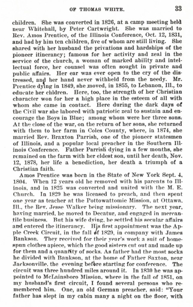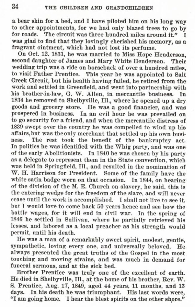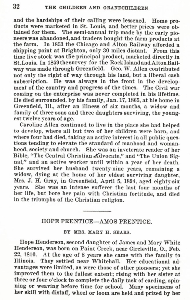 Now he enters the memo from his aunt Hope, 2nd born (1810) in the pioneer family, married Amos Prentice.
