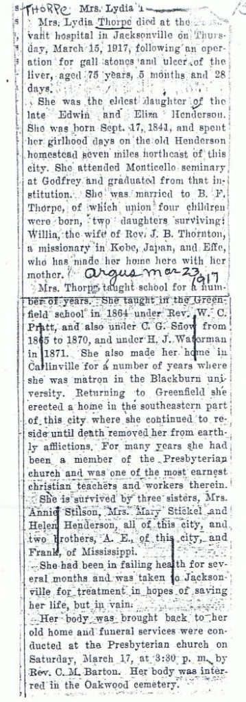 Due to an unintentional omission by my staff, the obituary of Lydia Thorpe Henderson went missing from Post #4. Rather than learning how to make an edit to #4, the “staff” presents it here.